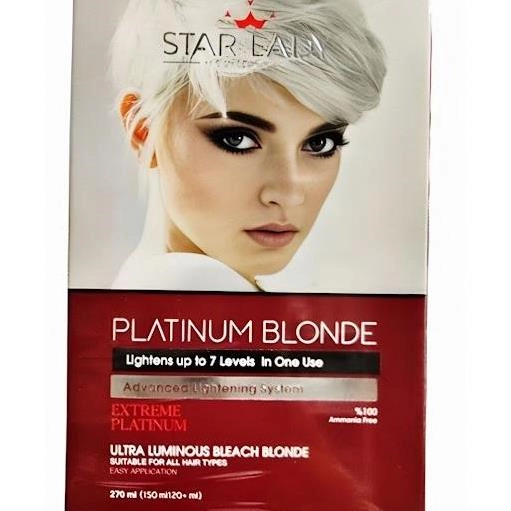رساندن مو به پایه سفید پلاتینه یا بدون زردی 🔸حفاظت از مو و جلوگیری از آسیب 🔸روشن کنندگی حداقل چند پایه بیشتر از دکلره 🔸قابل استفاده برای موهای آسیب دیده 🔸قابلیت استفاده برای موی آقایان پلاتینیوم بلوندر استارلیدی، با قدرت روشن کنندگی بالای خود می تواند موها را تنها در 1 مرحله تا 7 پایه روشن نماید. به عبارتی کرم پلاتینه استار لیدی موهای طبیعی را طی یک مرحله از رنگ طبیعی به رنگ پلاتینه روشن تبدیل می نماید. پلاتینوم بلوندر استارلیدی بدون جا گذاشتن رنگ زردی در بافت مو، موها را به پایه دکلره بسیار روشن رسانده و رنگ زیبا و جذابی را بدون آسیب رسانی به بافت مو و از بین بردن شادابی آنها بر روی موهای فرد ایجاد می کند. همچنین کرم پلاتینه استار لیدی فاقد آمونیاک بوده و در نتیجه فاقد عوارض جانبی همانند حساسیت و سوزش میباشد. این محصول دارای بافت روغنی می باشد تا از آسیب دیدگی موها جلوگیری کند. معمولا افراد برای روشن کردن مو از پودر دکلره یا دکوکرم استفاده می نمایند. اما معمولا در این روشها رنگ به ویژه رنگ طبیعی مو به طور کامل از بافت آن خارج نشده و نتیجه دکلره کردن، ایجاد موی دکلره با رنگ نارنجی یا بلوند متوسط (پایه دکلره7) می باشد. پودر دکلره موجب آسیب دیدگی شدید بافت مو شده و در صورت تکرار دکلره کردن جهت خارج کردن زردی از بافت مو، موجب تشدید آسیب دیدگی مو و رسیدن آن به حالت کشسانی می شود